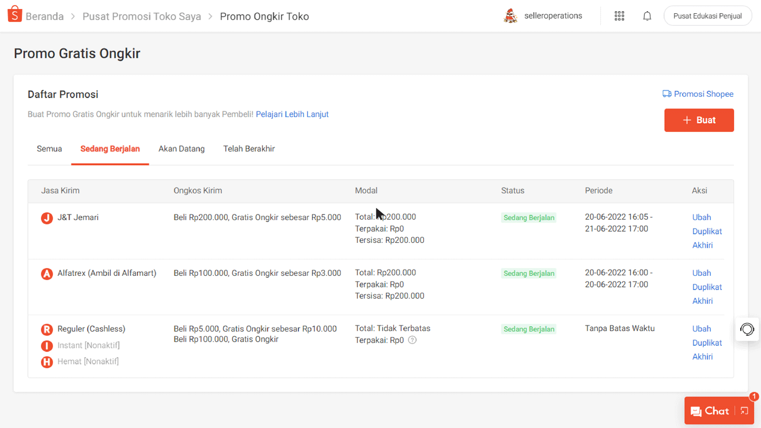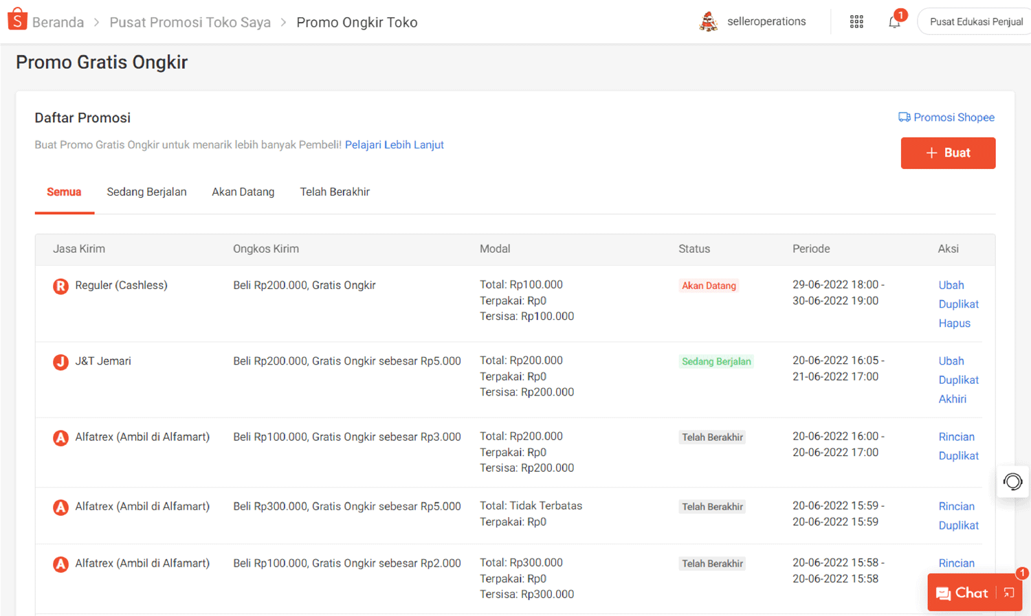 Anda dapat membuat promosi baru dengan klik tombol Buat ataupun melihat seluruh promosi yang telah dibuat di halaman Promo Gratis Ongkir.