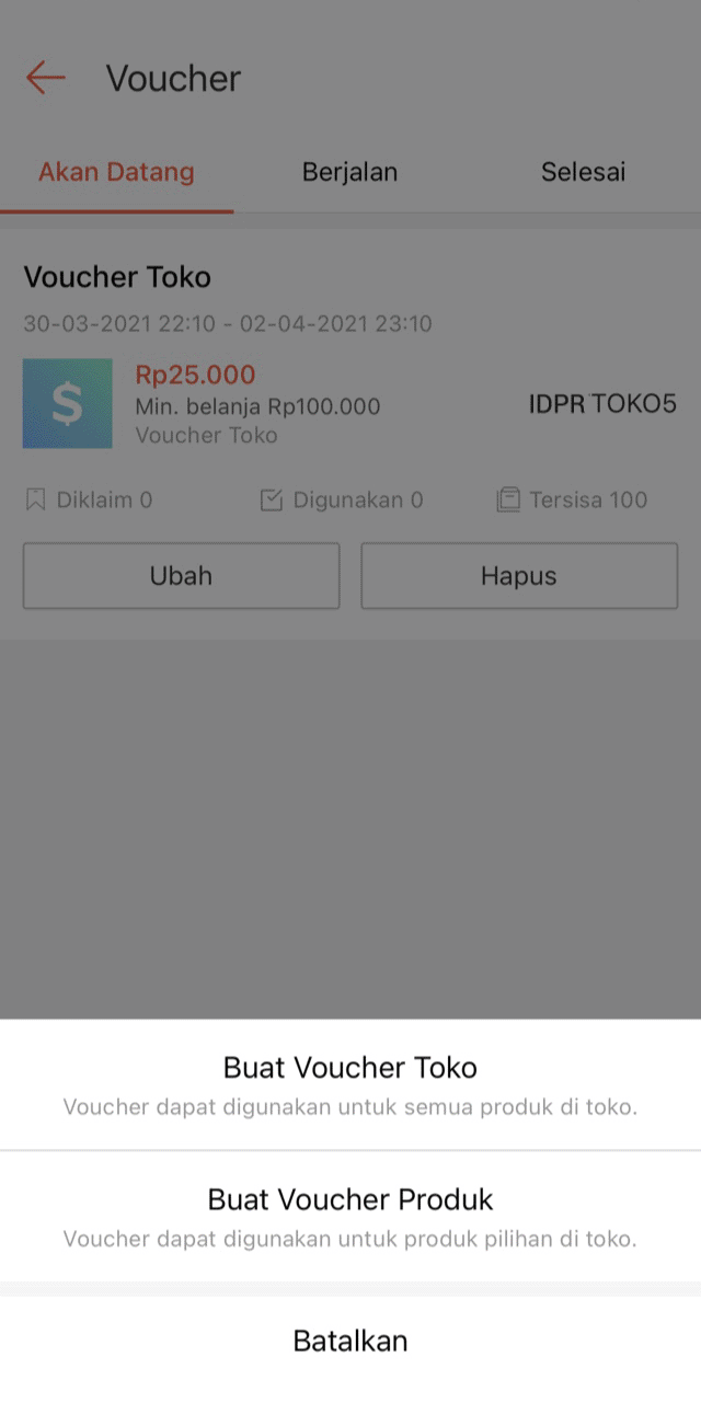 Pilih Toko Saya > pilih Promosi Toko > lalu pilih Voucher.